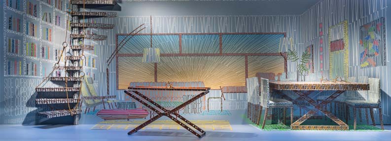 Hermès’ signature Pippa folding chair has the word “CHAIR” repeatedly printed on it, while the Hermès home valet has the word “VALET” encircling its outline – creating an atmospheric between the real and the false and multi-layered visual play with the eye. Other items including the steps and carpets are divided into two and three dimensions. ModernMantra (Hermès Home) turns our observation into fine line tickling the visual sense between words, visual engagement and reality.